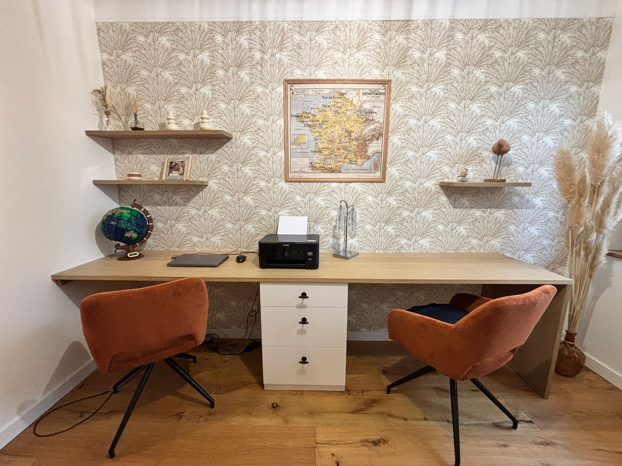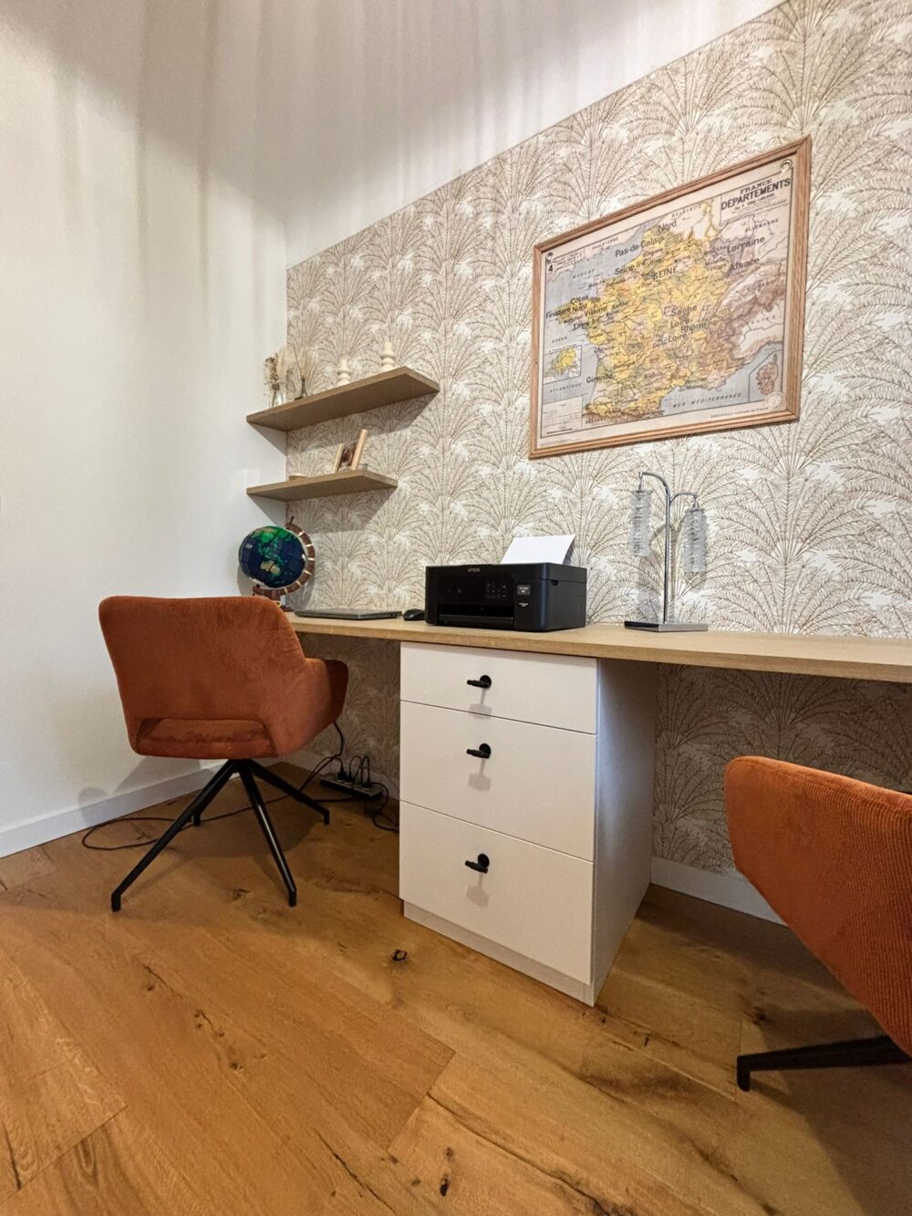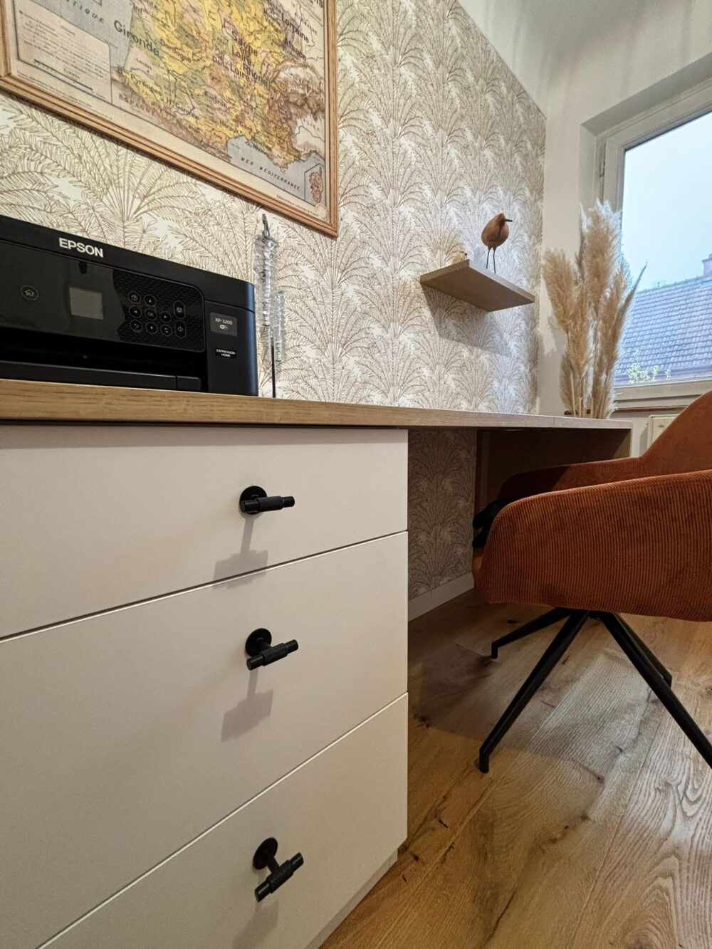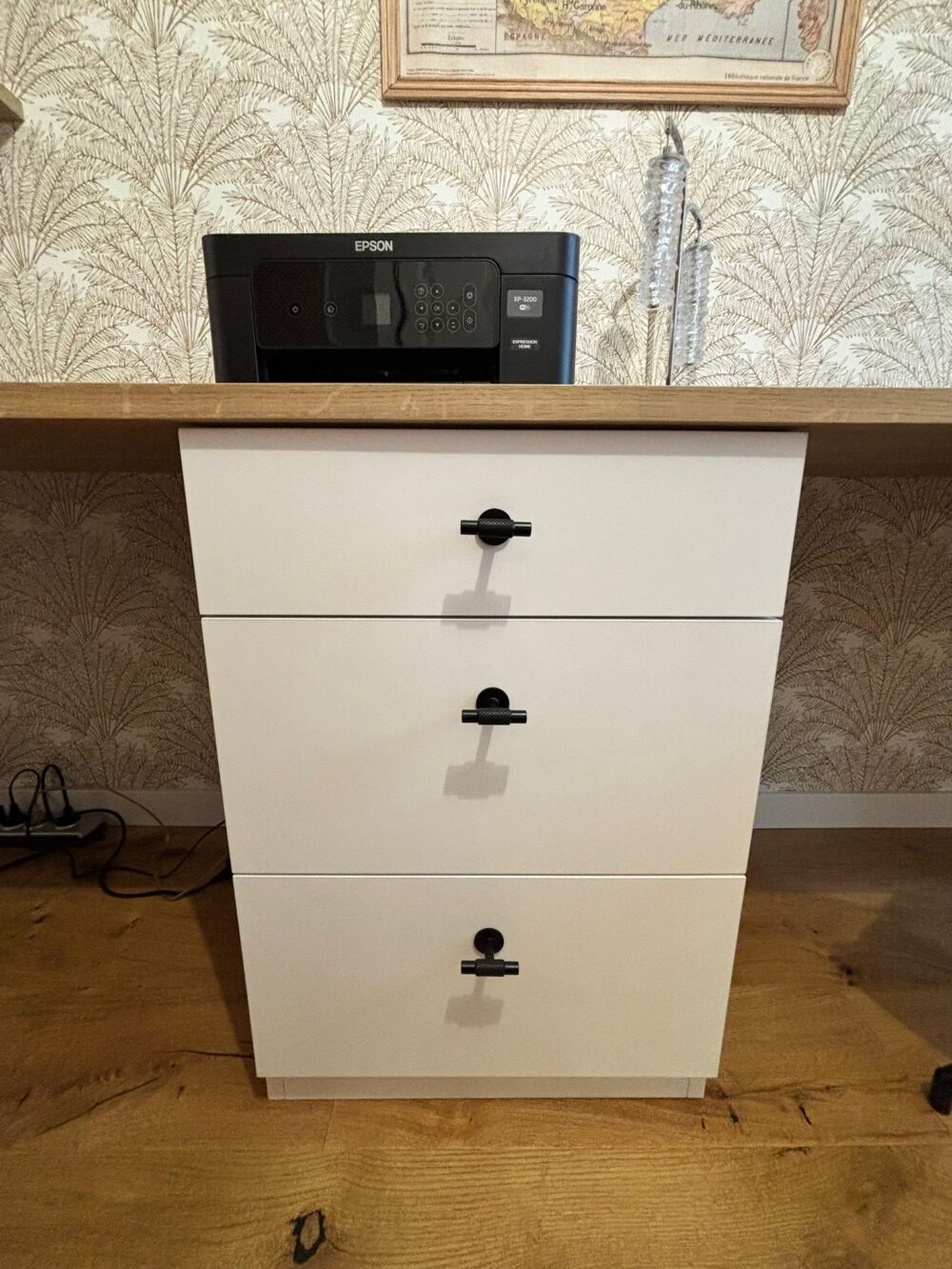 Les façades du bloc tiroirs en laqué mat blanc offrent une esthétique sobre et lumineuse, idéale pour créer une atmosphère de travail apaisante et moderne.
