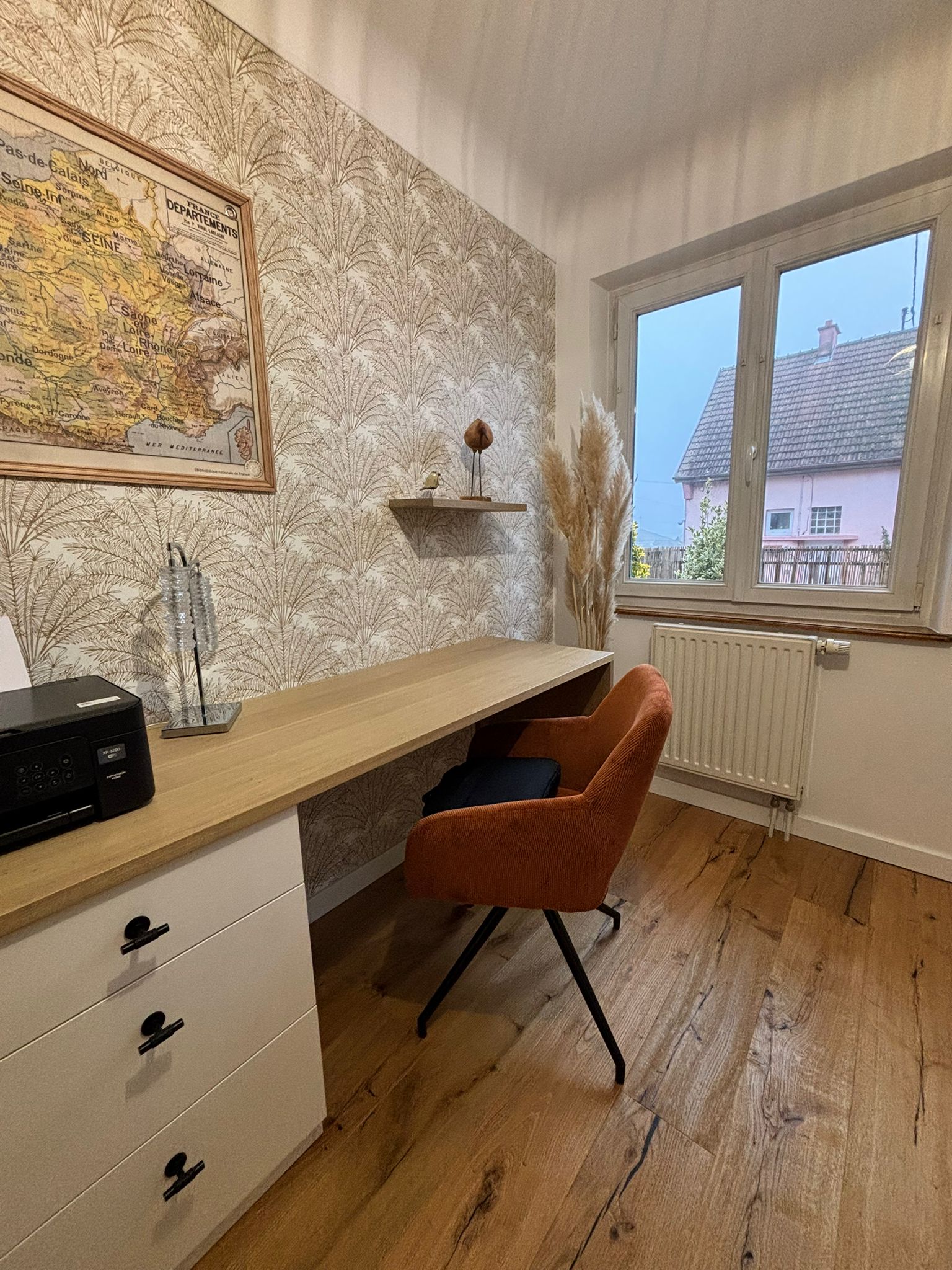 Le papier-peint frais et coloré a été subtilement sélectionné et le projet viendra se finaliser par la création sur mesure d’un joli coussin d’assise pour la banquette.